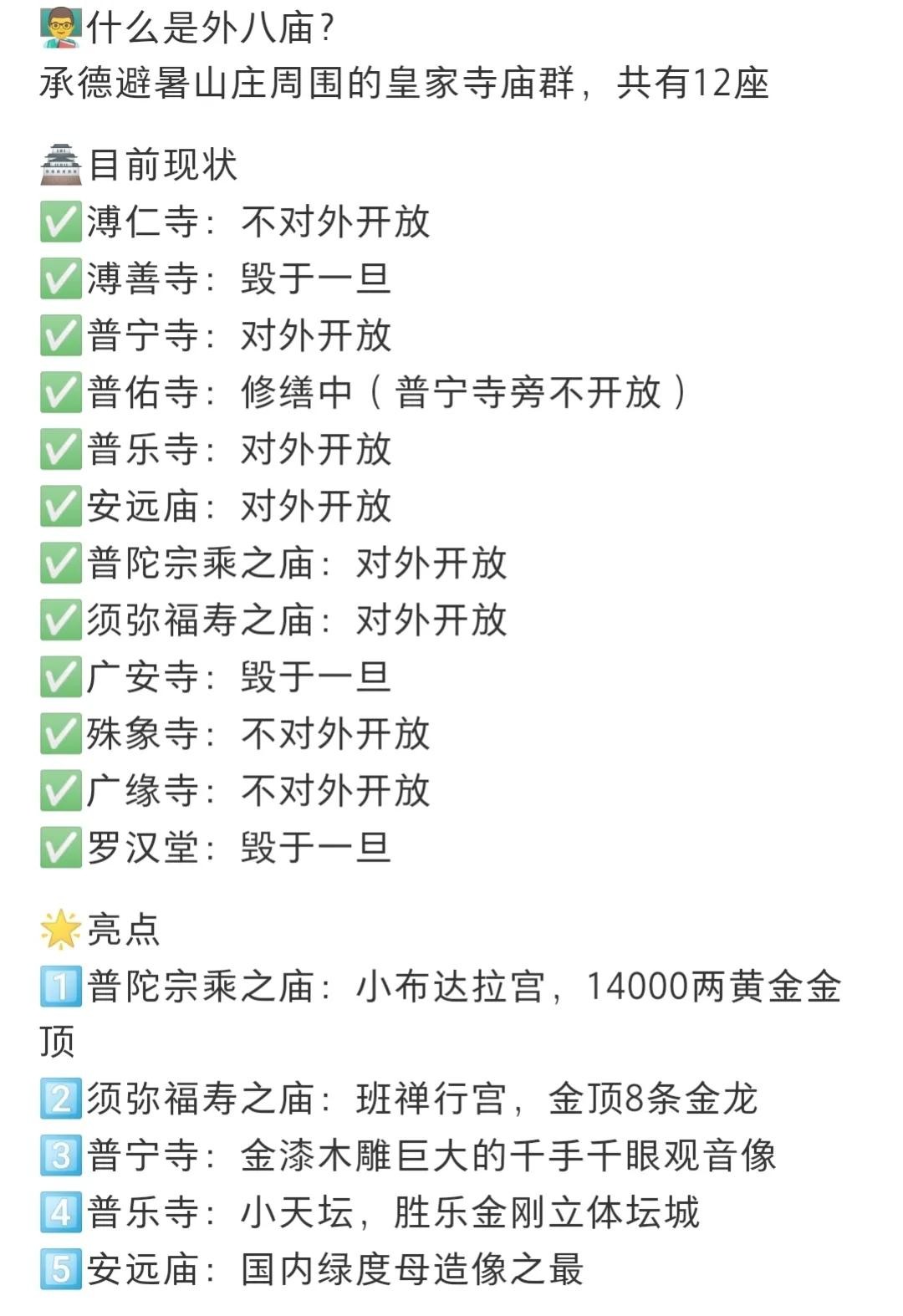 外八庙是指避暑山庄以外的八座藏传佛教寺庙,这些寺庙建筑风格独特,具有浓郁的藏传佛教文化气息。其中,普宁寺、普陀宗乘之庙、须弥福寿之庙等都是非常著名的景点。