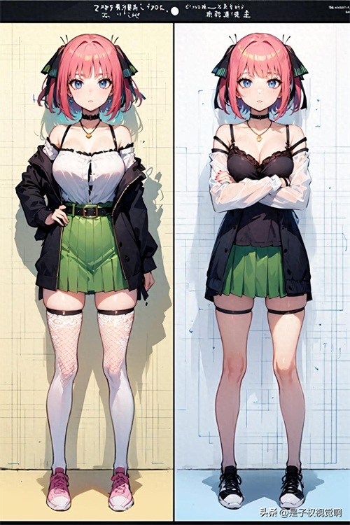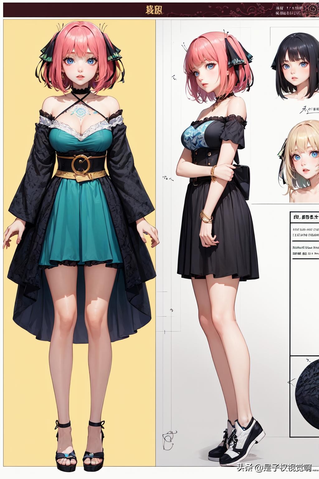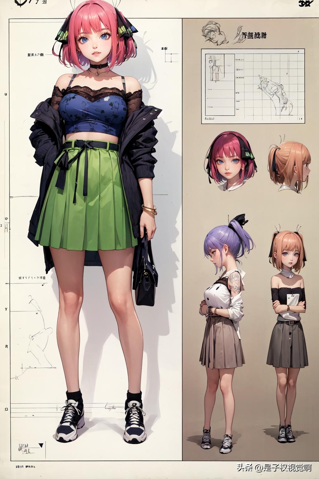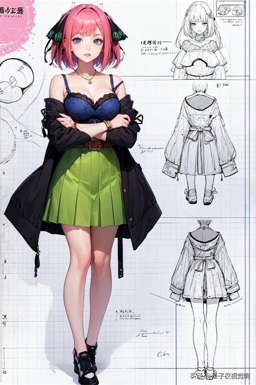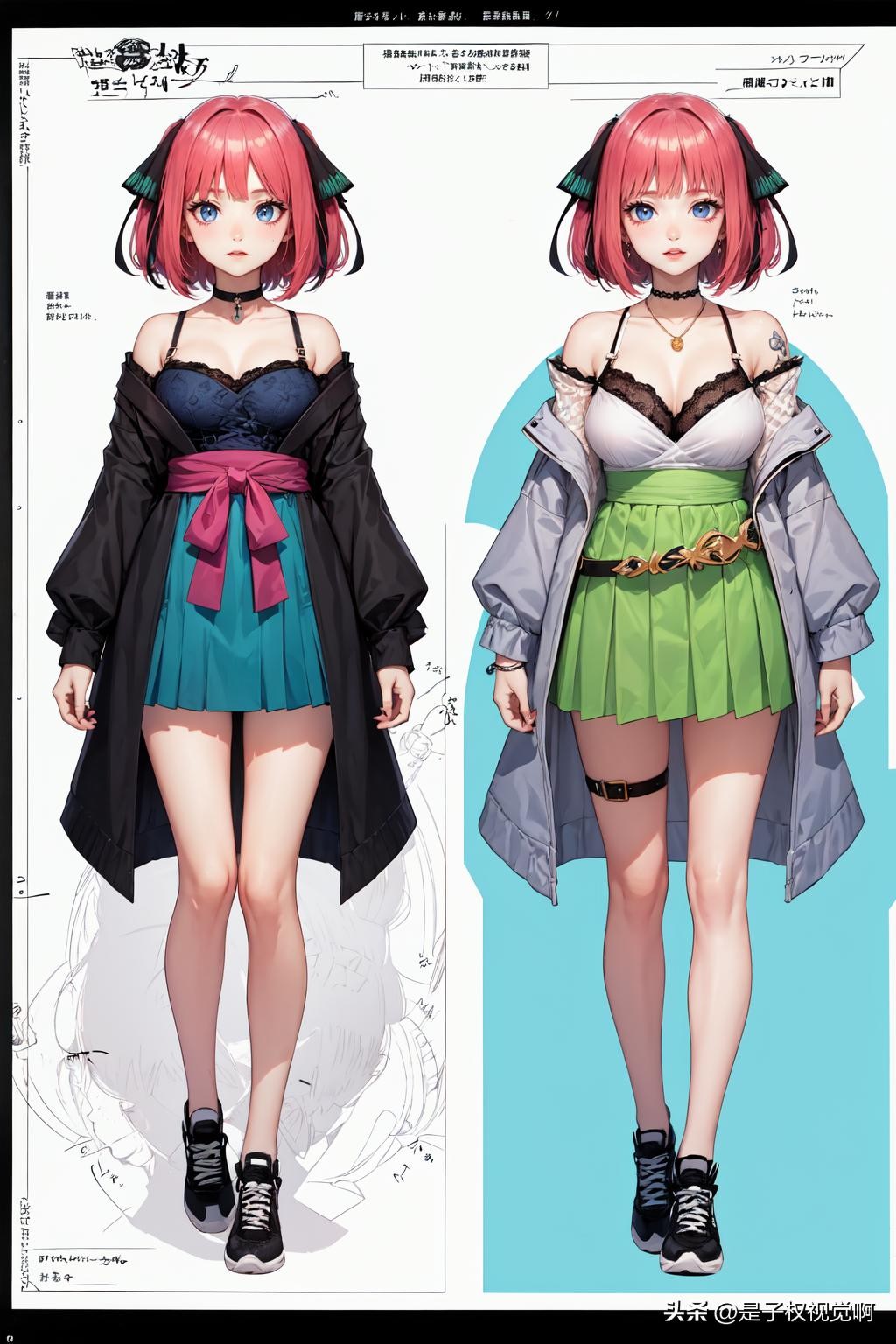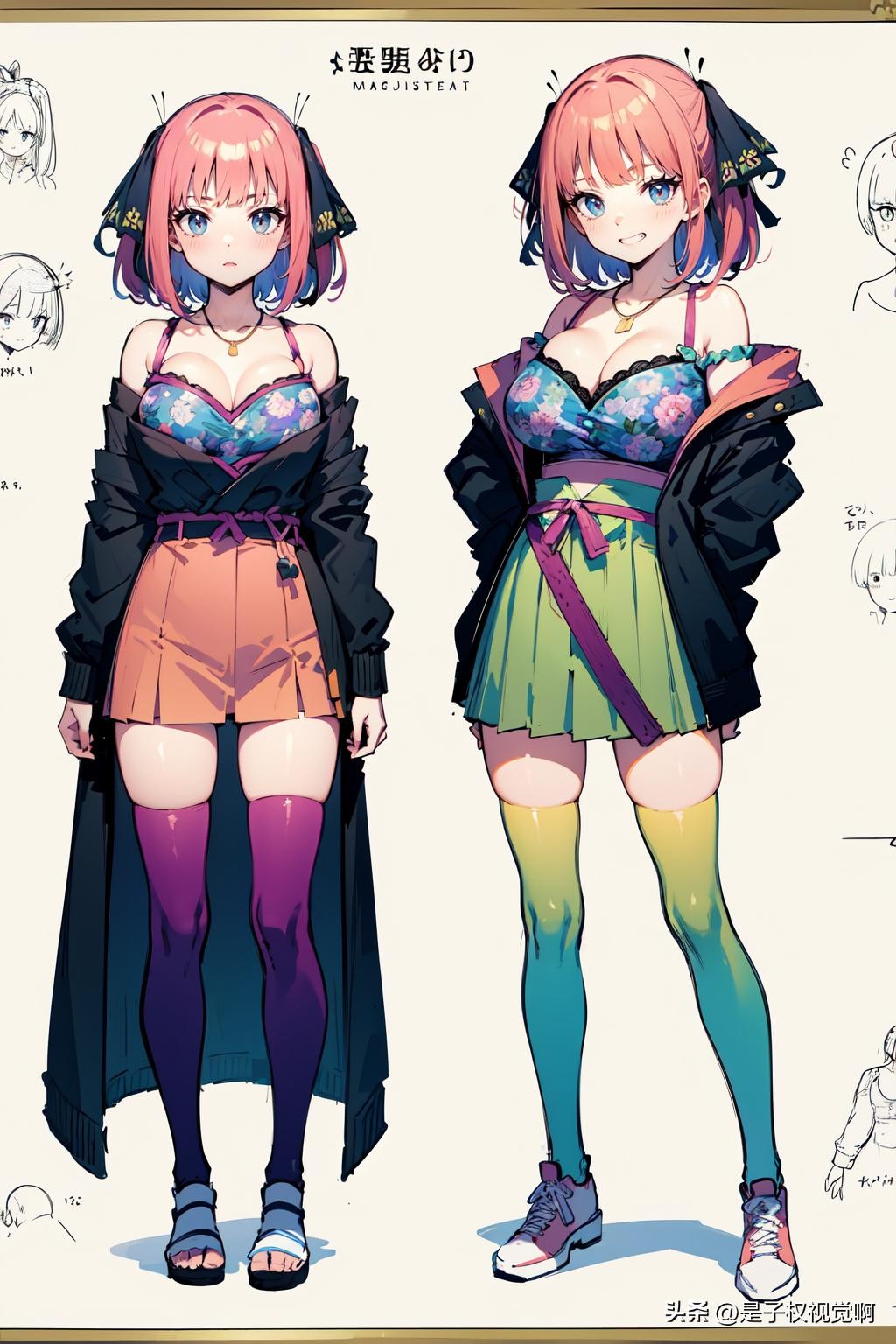 这组画面展现了中野二乃的形象,她散发着快乐、自然的笑容,展示出洁白的牙齿,仿佛一幅绝美的艺术杰作。这位少女身着浮世绘图案的抹胸连衣裙和浮世绘印花短裙,肩部敞露,搭配蕾丝半罩杯胸衣,展现出她完美的肩颈线条。