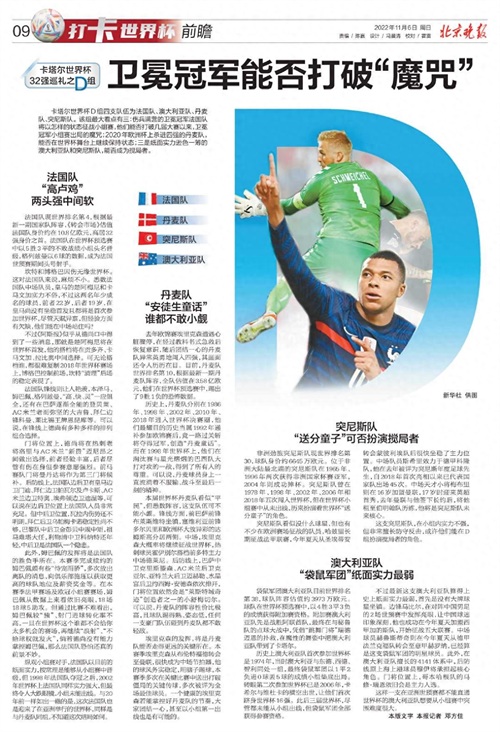 卡塔尔世界杯D组球队包括:卫冕冠军法国队、期待上演“童话”的丹麦队、小组“鱼腩”突尼斯队、“袋鼠军团”澳大利亚队。