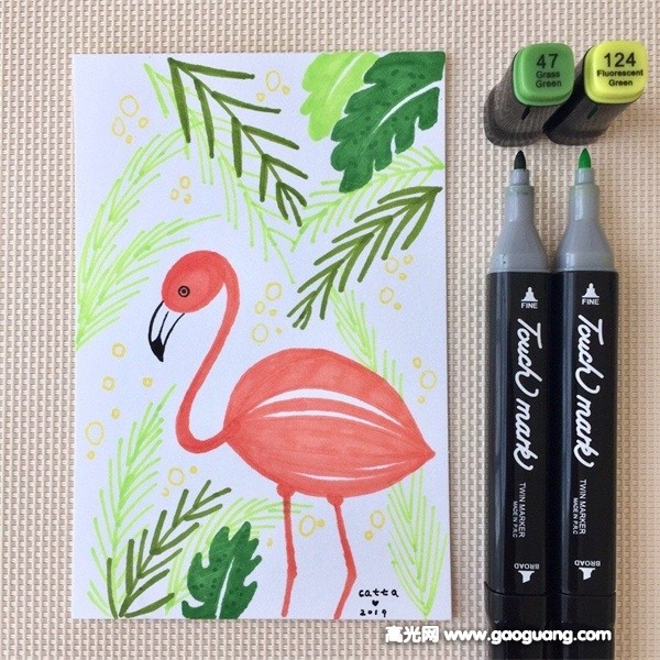 5、 最后画一个好看的背景装饰一下,这样火烈鸟简笔画就完成啦!