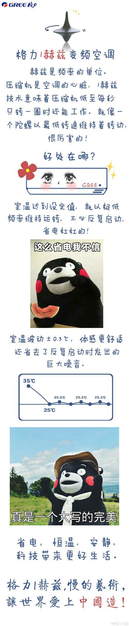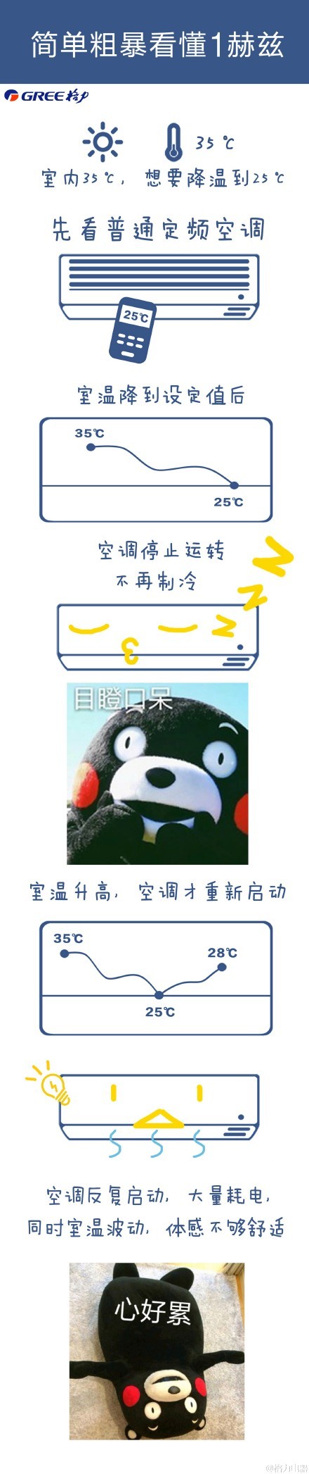 格力的1HZ技术是什么?空调运行到设定温度后会停机,温度回升后再开启,这样反复启停很费电。格力创新的变频技术能使空调达到设定温度后以最低1赫兹的频率运行不停机,就如同汽车以怠速状态运行不熄火,降低了重复启停的能耗。此外,还能以±0.5度的幅度控温,省电又舒适!再不懂?看图!