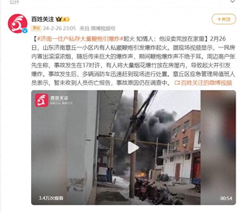2月26日,山东济南章丘一小区内有人私藏鞭炮引发爆炸起火。据现场视频显示,一民房内冒出滚滚浓烟,随后传来巨大的爆炸声,期间鞭炮爆炸声不绝于耳。周边商户张先生称,事故发生在17时许,有人将大量烟花爆竹放在房屋内,导致起火并引发爆炸。事故发生后,多辆消防车迅速赶到现场进行处置。章丘区应急管理局值班人员表示,暂未收到人员伤亡报告,事故原因仍在调查中。