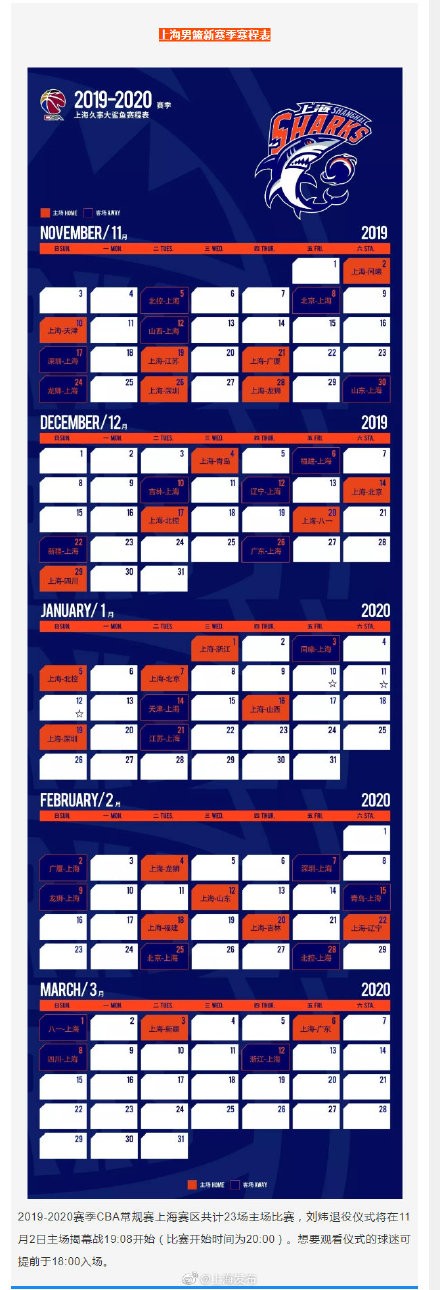 上海男篮CBA新赛季赛程公布