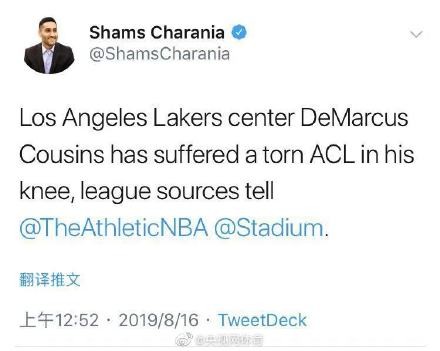 考辛斯韧带撕裂 【考辛斯左膝前十字韧带撕裂 或赛季报销】北京时间8月16日,根据The Athletic记者Shams Charania报道,多位消息人士透露,湖人中锋德马库斯-考辛斯遭遇左膝前十字韧带撕裂,预计将会至少缺席赛季的大部分时间,也可能会赛季报销。祝福考神早日康复