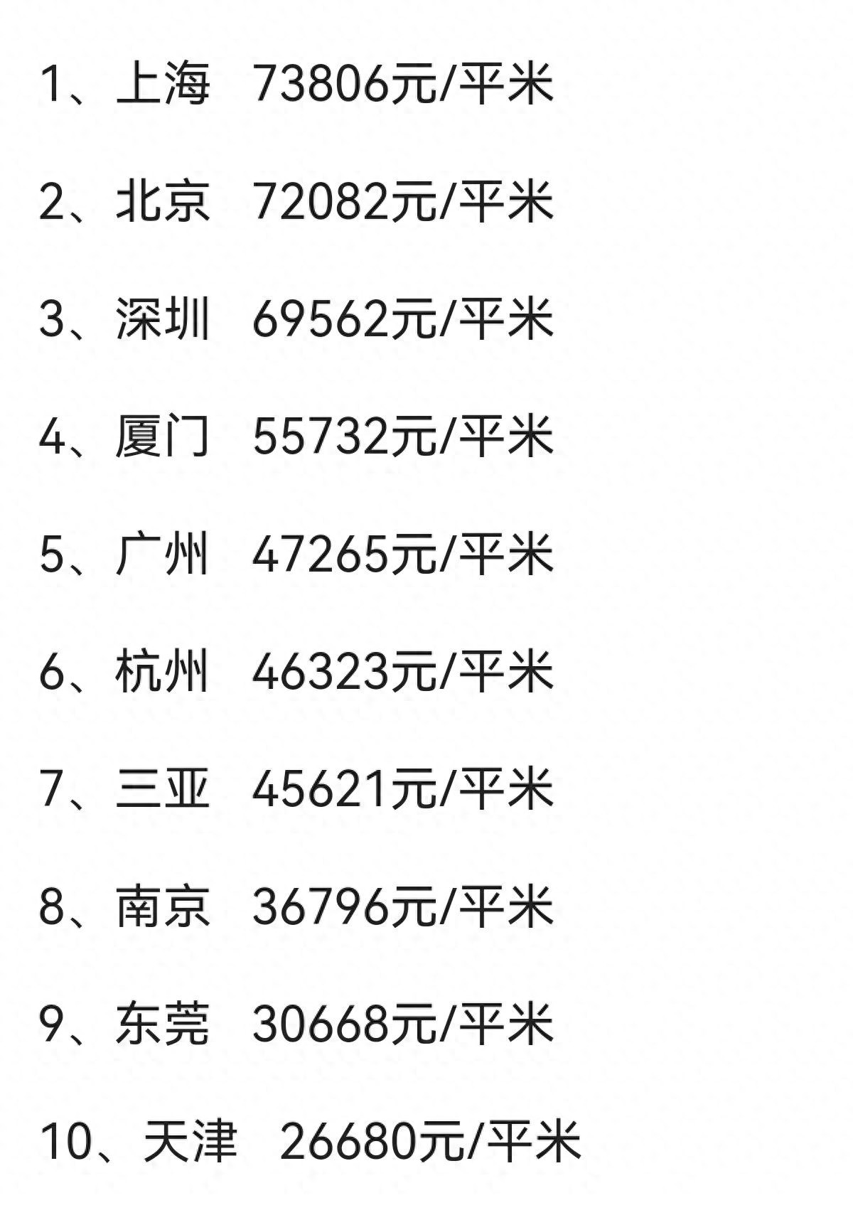 上海、北京、深圳、厦门、广州占据了最高房价的前五名。杭州、三亚、南京、东莞、天津紧随其后。