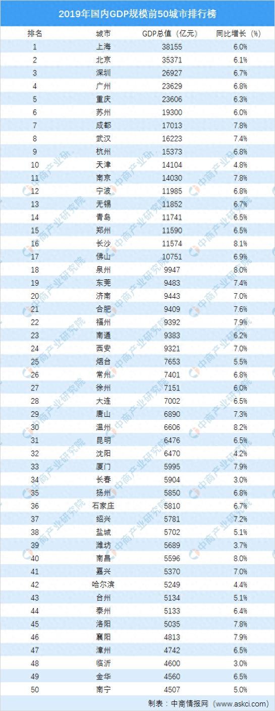中商情报网讯:随着各地GDP的公布,2019年全国GDP规模前50城市排行榜已经出来了。其中,排名前十的城市分别是上海、北京、深圳、广州、重庆、苏州、武汉、成都、杭州和天津。前十中,上北深广四个一线城市仍然位居前四,其中上海和北京经济遥遥领先,2019年上海GDP总量38155.32亿元,比上年增长6.0%。2019年,北京GDP总量35371.3亿元,比上年增长6.1%。深圳、广州紧随其后,GDP总量分别为26927.09亿元、23628.6亿元。2016年深圳GDP总量赶超广州,2019年深圳经济总量比广州多3298.4亿元,近几年两城经济差距越来越大。不仅如此,2019年重庆GDP仅比广州少22.83亿元,未来重庆或赶超广州。