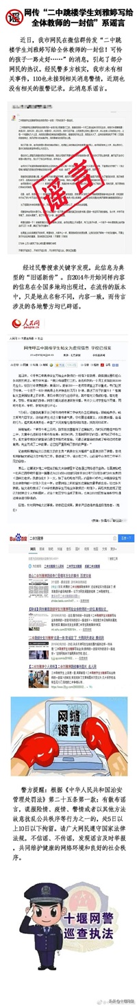 我市网传“二中跳楼学生刘雅婷致全体教师的一封信” 系谣言