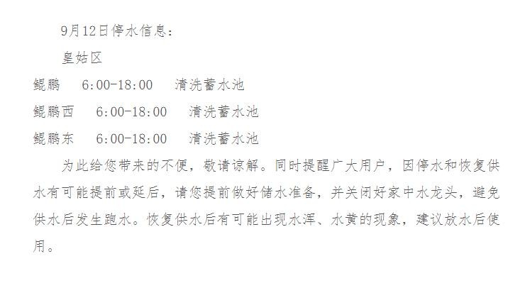 9月12日停水信息: