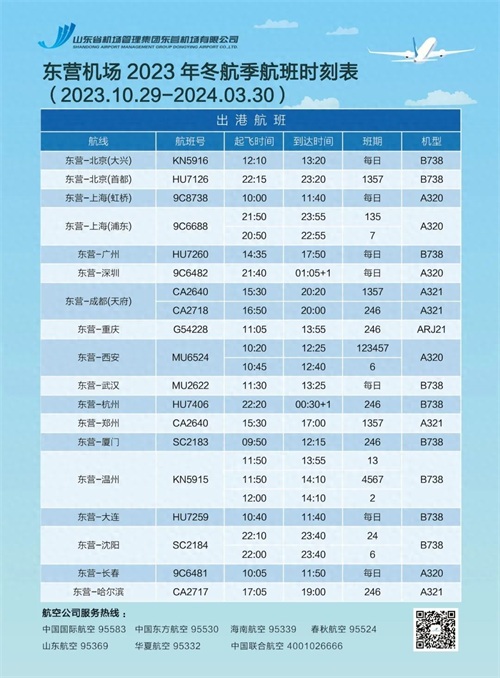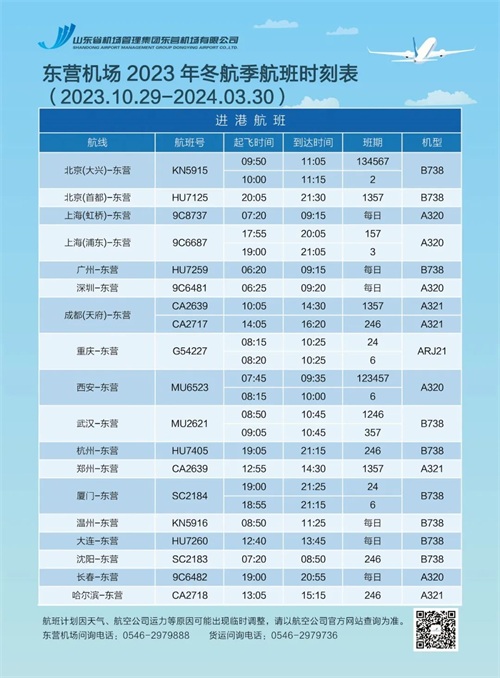 东营机场2023年冬航季航班时刻表