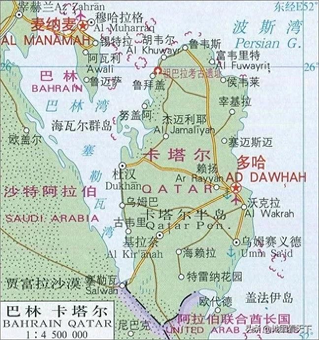 卡塔尔位于海湾西南岸卡塔尔半岛上,濒临波斯湾,南邻沙特阿拉伯和阿拉伯联合酋长国,西与巴林、沙特阿拉伯隔海相望。
