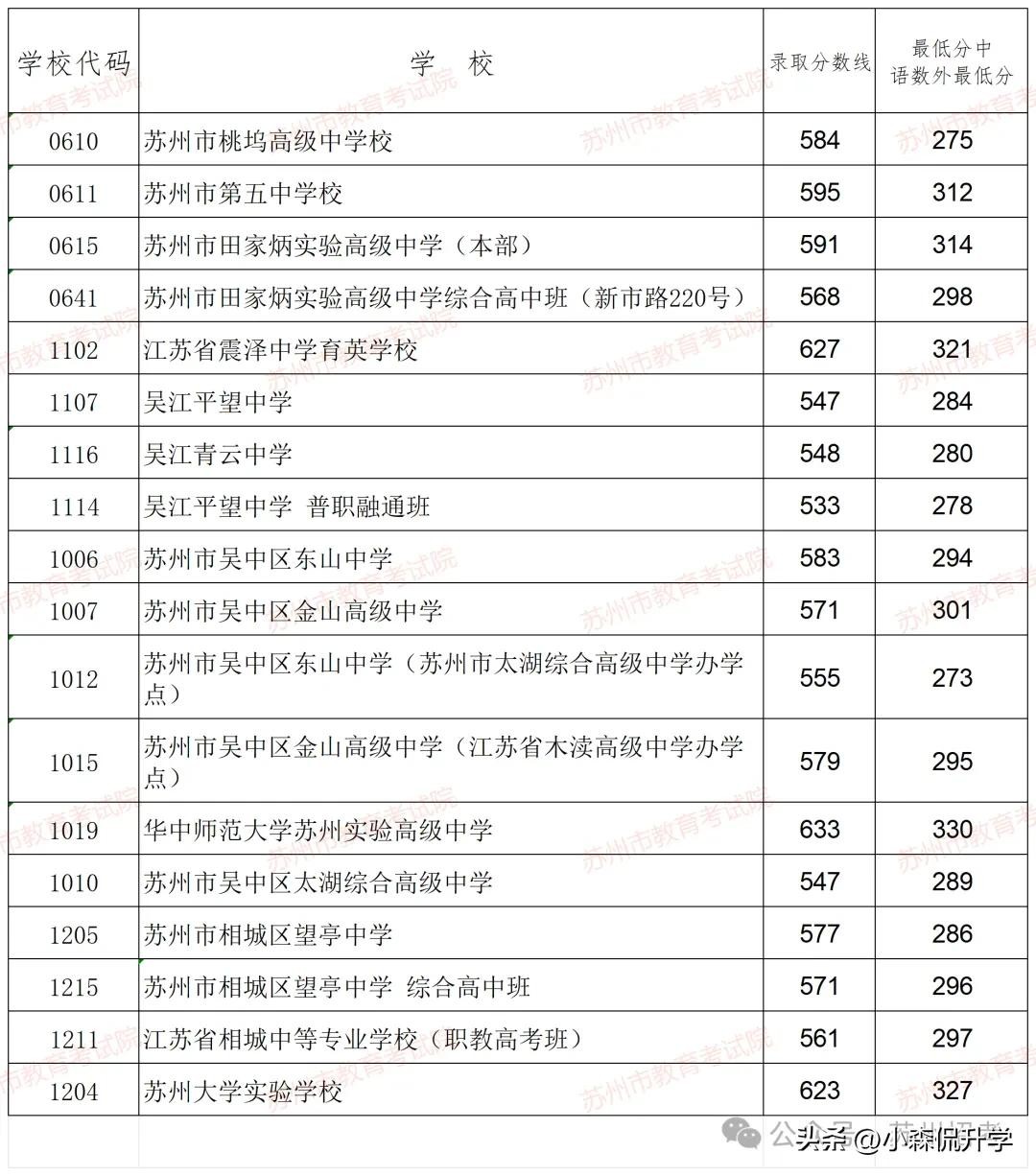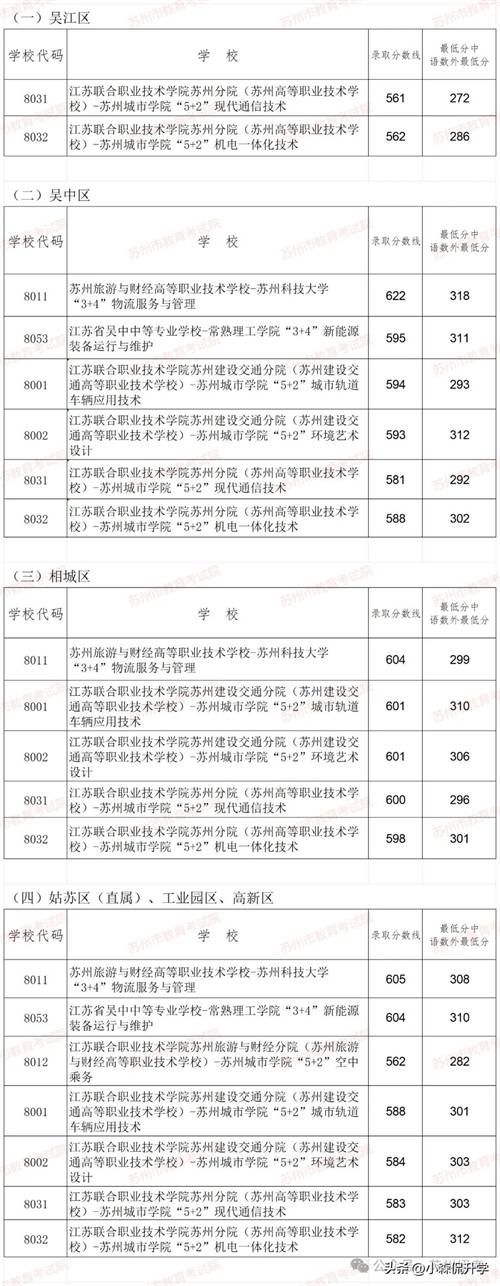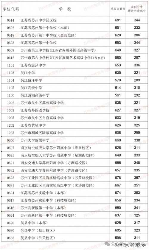指标生最低控制线:姑苏区(直属)、工业园区、高新区603分;吴江区震泽中学622分,其他四星级及热点学校576分;吴中区600分;相城区603分。