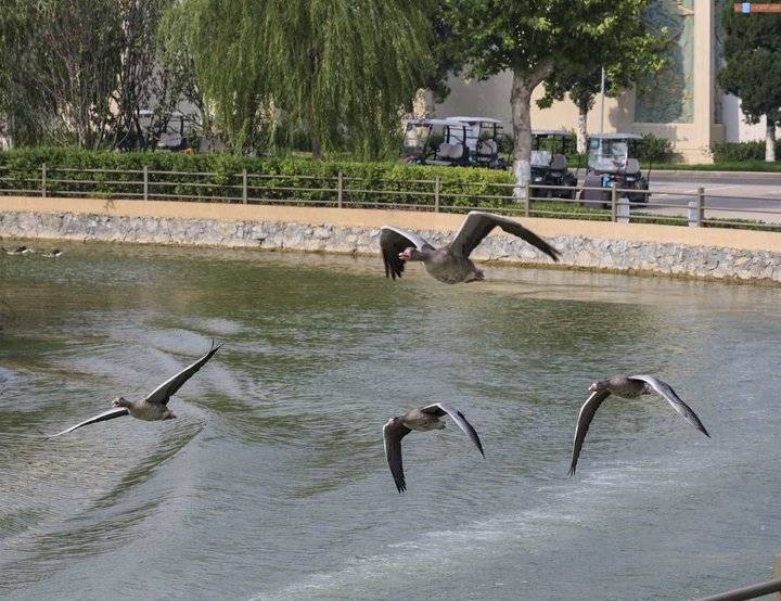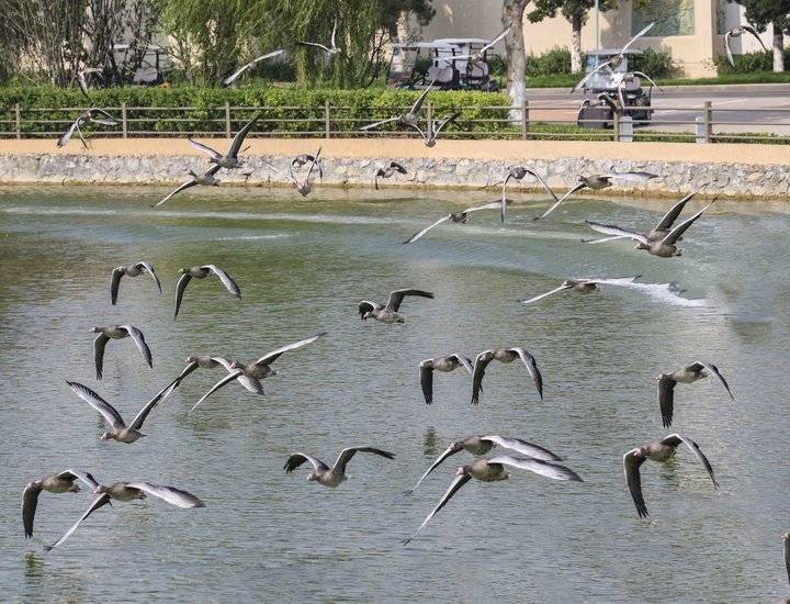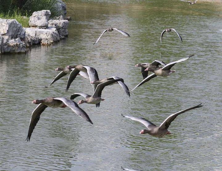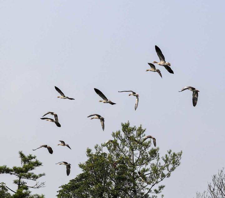 灰雁是民间俗称大雁的一种,灰雁是雁属中体形大,个体重的鸟类。飞行时双翼拍打用力,振翅频率高,脖子较长。有迁徙的习性,迁飞距离也较远。喜群居,飞行时成有序的队列,有一字形、人字形等。为一夫一妻制,雌雄共同参与雏鸟的养育。腿位于身体的中心支点,行走自如。有扁平的喙,边缘锯齿状,有助于过滤食物。