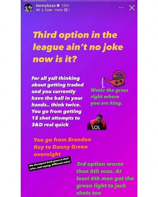 贝兹莫尔写道:“球队三当家在联盟不是笑柄了吗?对于那些主打持球的球员来说申请交易还是要谨慎啊,你可能在交易过后从一个场均出手15次的球员变成了一个3D球员。”