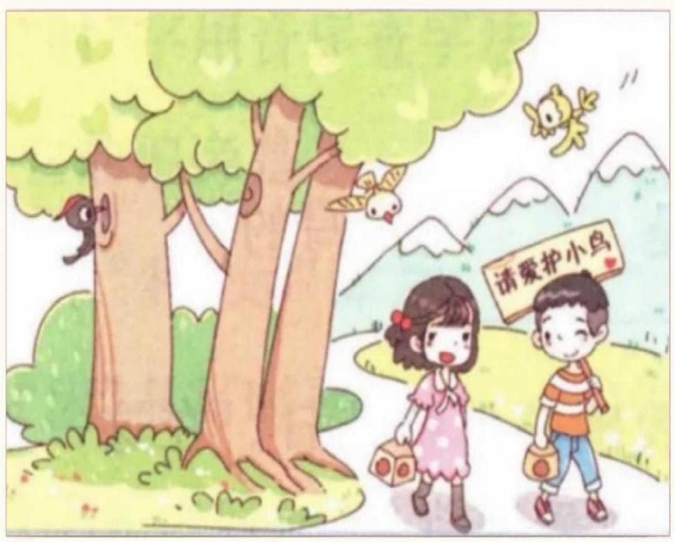 一天早上,小红和小亮一起来到森 林里。他们要为这里的小鸟做鸟窝,还 准备在鸟窝旁立一块“请爱护小鸟”的 牌子。想到小鸟住进鸟窝肯定会特别高 兴,他们开心地笑了。