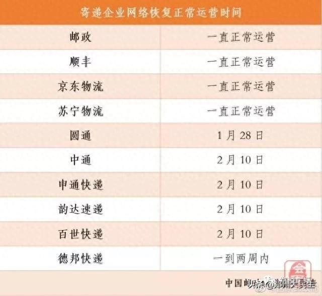 记者从国家邮政局官网了解到,在中国邮政、顺丰速运、京东物流、苏宁物流正常运营的基础上,2月10日起,中通快递、圆通快递、申通快递、韵达速递以及百世快递将陆续恢复到正常运营模式。