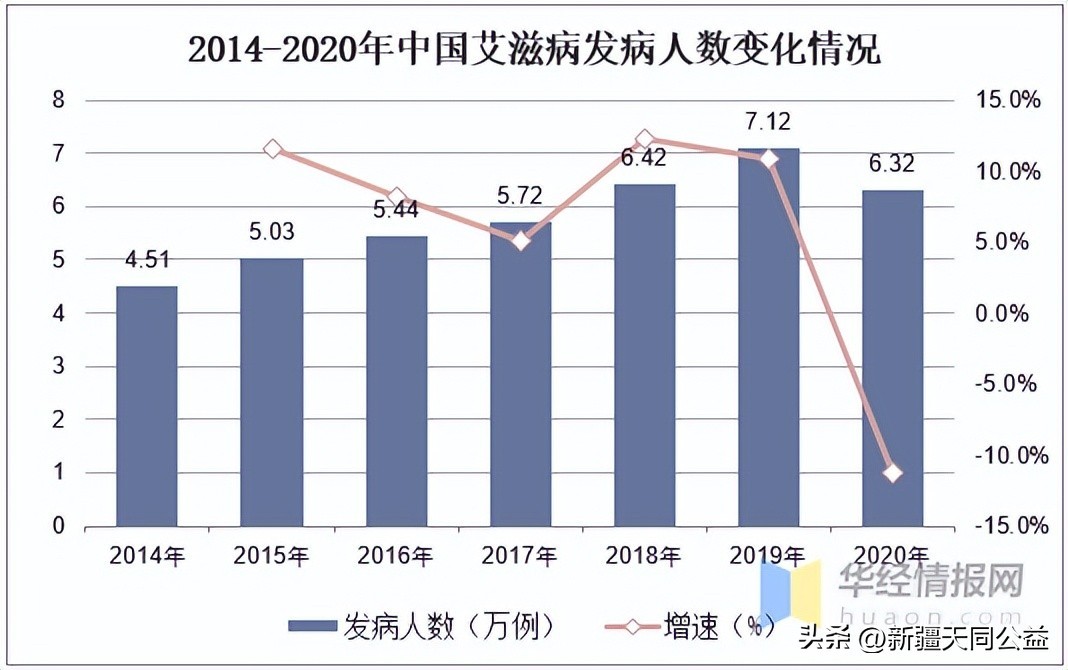 根据中国疾病预防控制中心的数据显示,2019年中国艾滋病发病人数为7.12万例,同比上升10.9%。随着中国政府对于艾滋病知识的宣传,2020年艾滋病发病人数有所下降,达到6.32万例,同比下降11.2%。