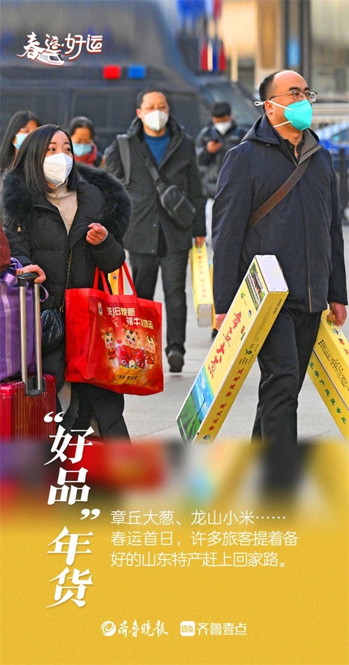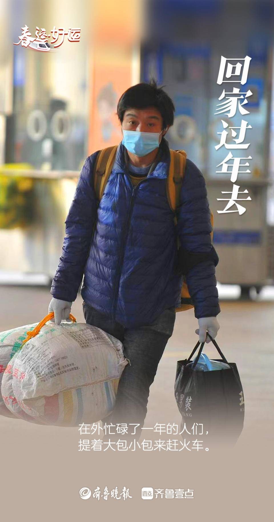 在济南火车站,旅客们提着大包小裹的年货,脚步匆匆,行囊里载满了憧憬与希望。