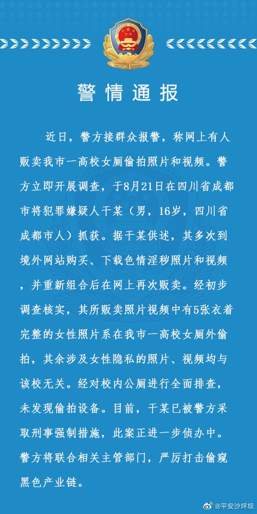 有人贩卖女生校园内如厕照片和视频,重庆沙坪坝警方通报:16岁嫌犯已被抓,校