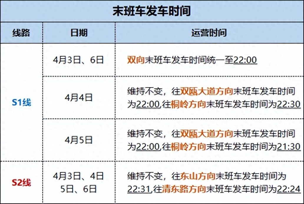 清明假期将近,4月3日、6日(清明假期前一天及最后一天),温州轨道交通线网运营时间有调整,这两天,S1线双向末班车发车时间统一调整至22:00,S2线运营时间维持不变,具体调整内容如下: