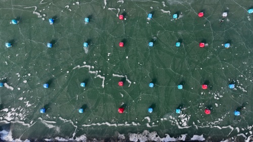 2025年1月1日,冰钓大赛参赛者在帐篷里参加比赛(无人机照片)。新华社记者 王鹏 摄