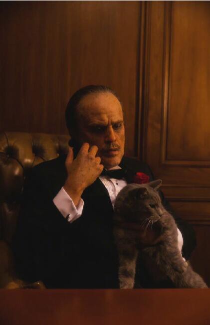 “盆栽哥”模仿《教父》中马龙·白兰度的造型