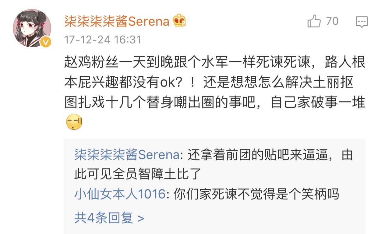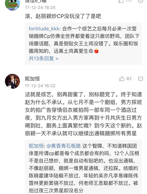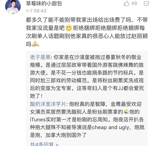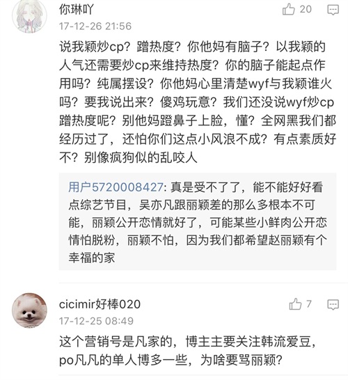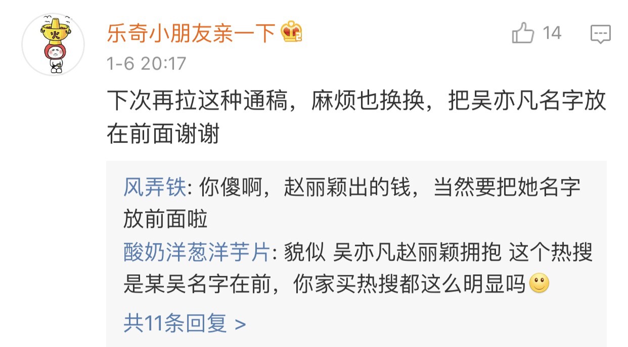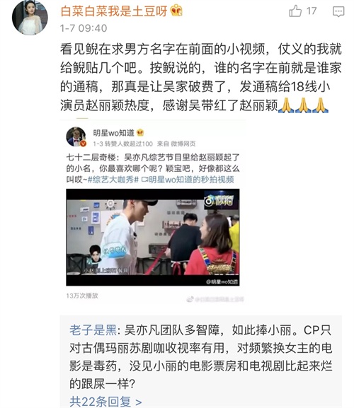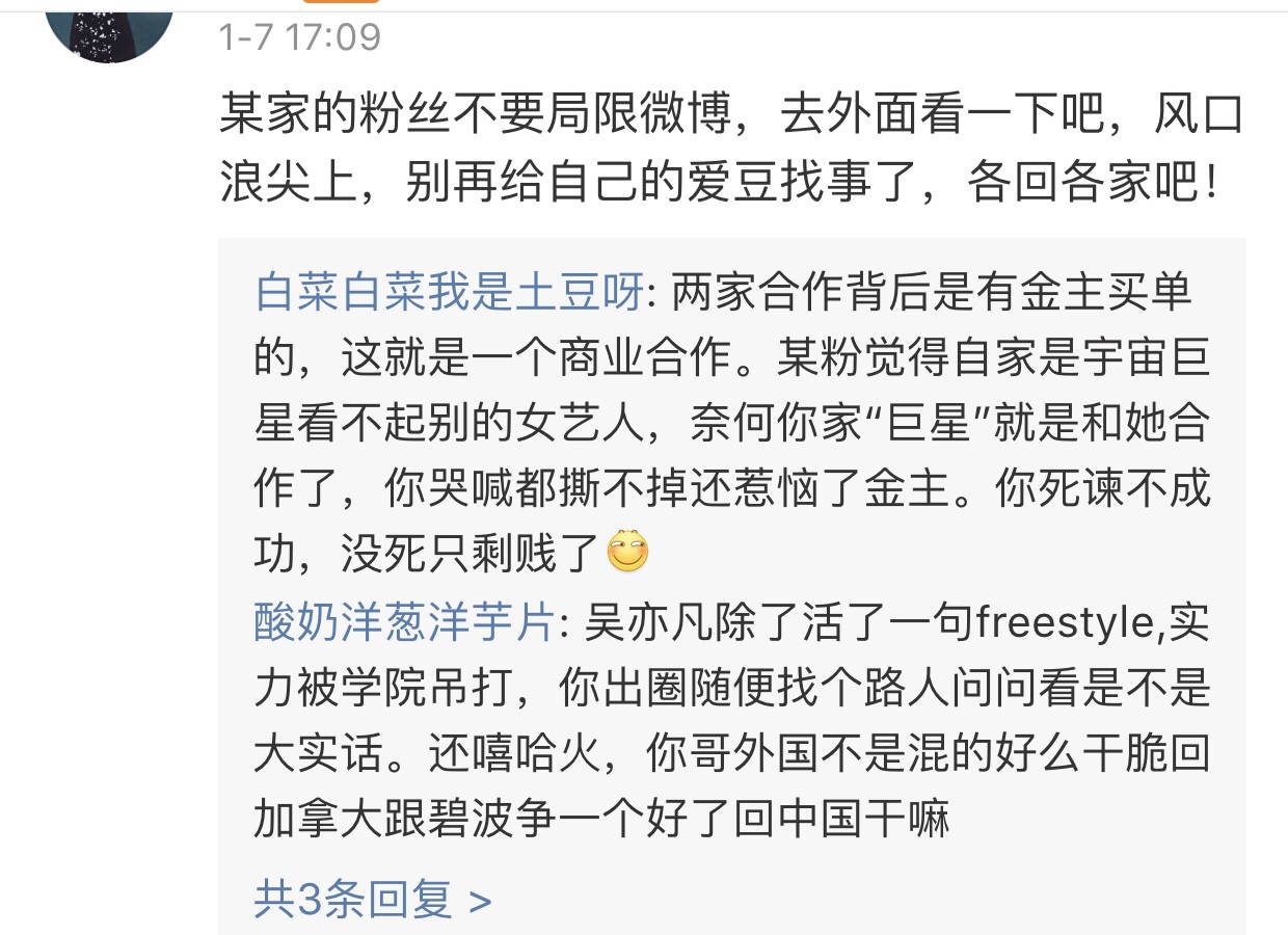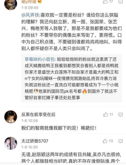 这种事情在鹿晗关晓彤事件中也发生,鹿晗公开的时候双方的粉丝也是撕得不可开交,两人的好事也被喷得很惨。其实这种心理很可怕,主要是这些人太闲了,对自己的偶像有一些幻想,因此觉得自己的偶像很完美,谁都配不上。这样只会使两人都很难看,既然是自己的偶像为什么让他们更好过些呢,他们合作是因为关系好才合作,在一起是因为爱,为什么要互撕给自己的偶像添堵呢?下面我们来看一下吴亦凡和赵丽颖的粉丝互撕得有多厉害,简直就是给自己的偶像抹黑。