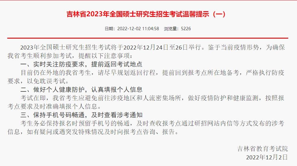 2023年全国硕士研究生招生考试将于2022年12月24日至26日举行。鉴于当前疫情形势,为确保我省考生顺利参加考试,提醒以下注意事项:
