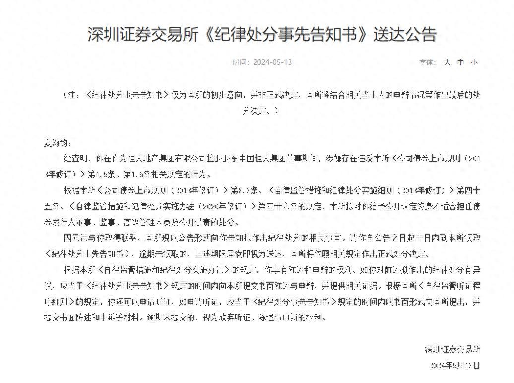 5月13日,深交所公告,经查明,夏海钧在作为恒大地产集团有限公司控股股东中国恒大集团董事期间,涉嫌存在违反深交所《公司债券上市规则(2018年修订)》第1.5条、第1.6条相关规定的行为。深交所拟对其给予公开认定终身不适合担任债券发行人董事、监事、高级管理人员及公开谴责的处分。因无法与夏海钧取得联系,深交所以公告形式向夏海钧告知拟作出纪律处分的相关事宜。