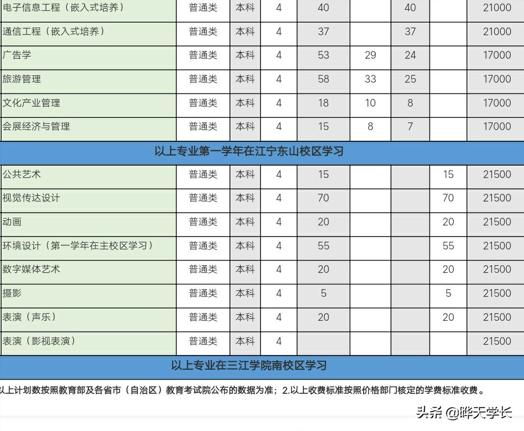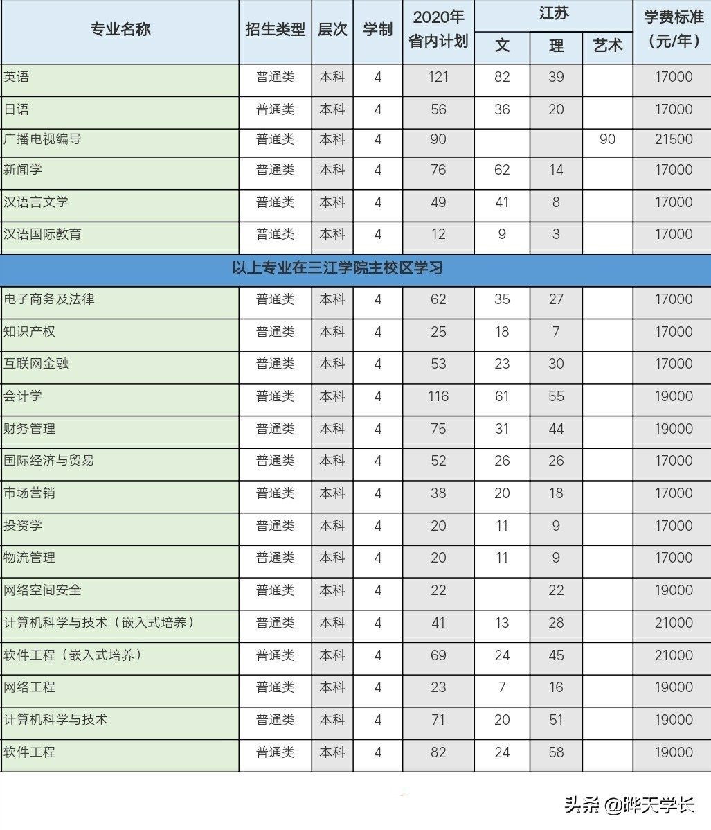 三江学院2020高考江苏省各专业招生计划以及各专业学费学制