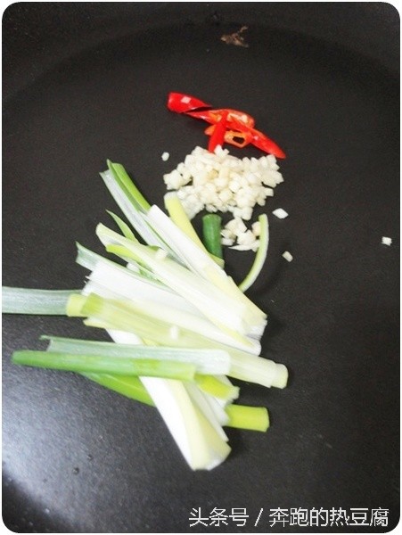 4、平底锅放半勺有,放入葱段,辣椒,蒜炒出来香味。