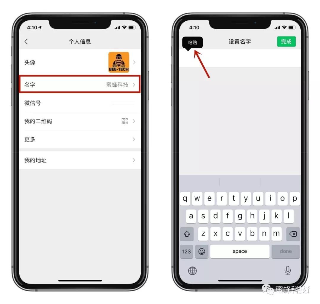 打开微信APP,前往设置点击【名字】,长按【黏贴】刚才复制的空白昵称,点右上角【完成】就设置好了。