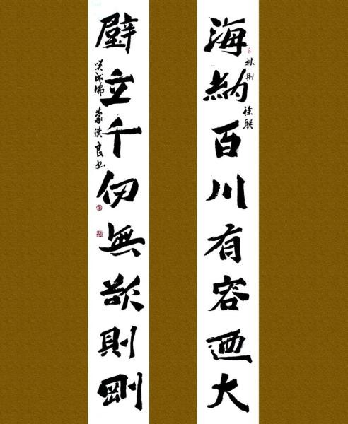 海纳百川,有容乃大;壁立千仞,无欲则刚。此联为清末政治家林则徐任两广总督时在总督府衙题书的堂联。意为:大海因为有宽广的度量才容纳了成百上千的河流;高山因为没有勾心斗角的凡世杂欲才如此的挺拔。上下联最后一字——“大”与“刚”,意思是说,这种 浩然之气,最伟大,最刚强。更表明了作者至大至刚的浩然之气。这种海纳百川的胸怀和“壁立千仞”的刚直,来源于“无欲”。这样的气度和“无欲”情怀以及至大至刚的浩然之气,正是心理健康不可缺少的维生素。