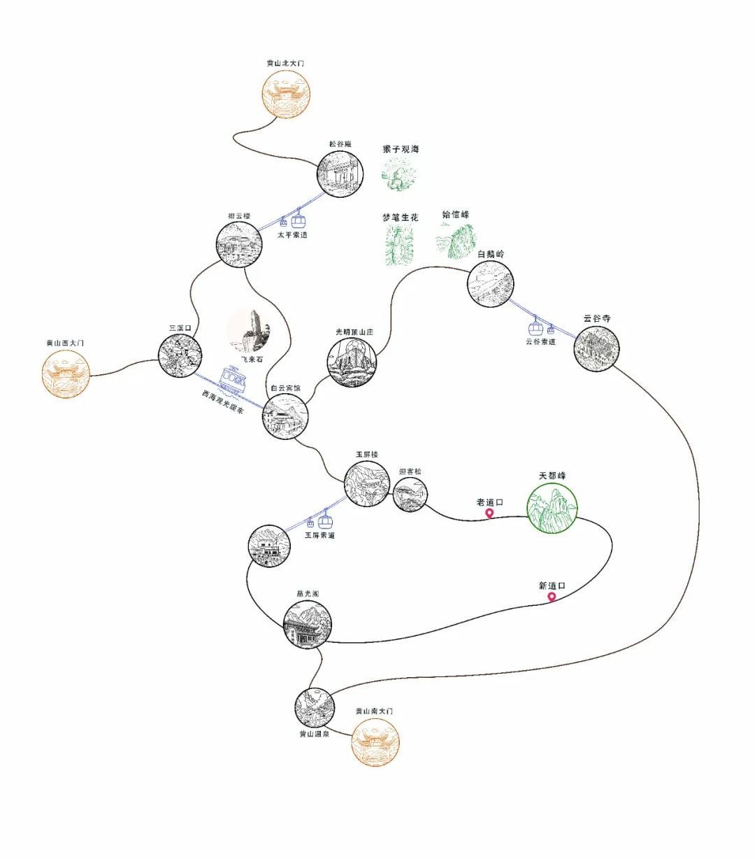 天都峰目前共有新、老道口两个出入口,整个峰内除鲫鱼背、一线天等险要路段外,实行双向通行,游览天都峰约需4小时。
