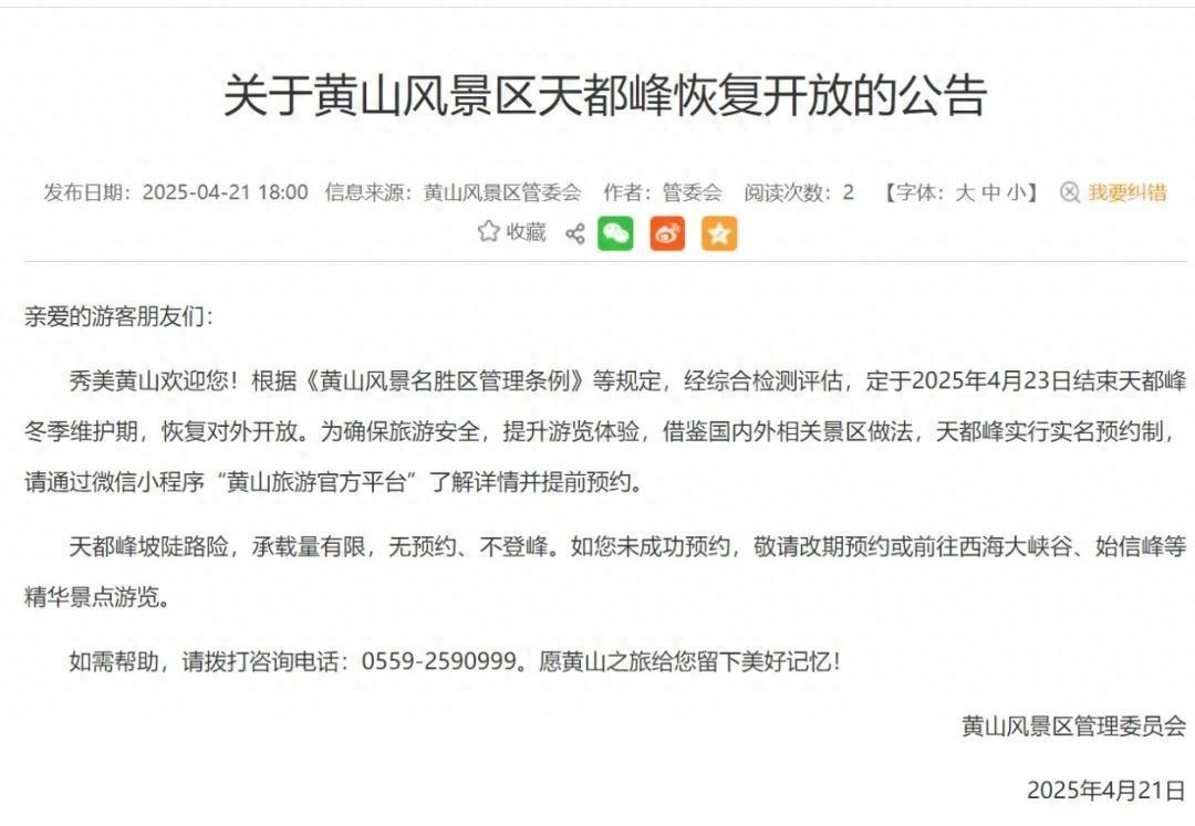 4月21日,黄山风景区管理委员会发布公告称,黄山天都峰将于4月23日结束冬季维护期,恢复对外开放。