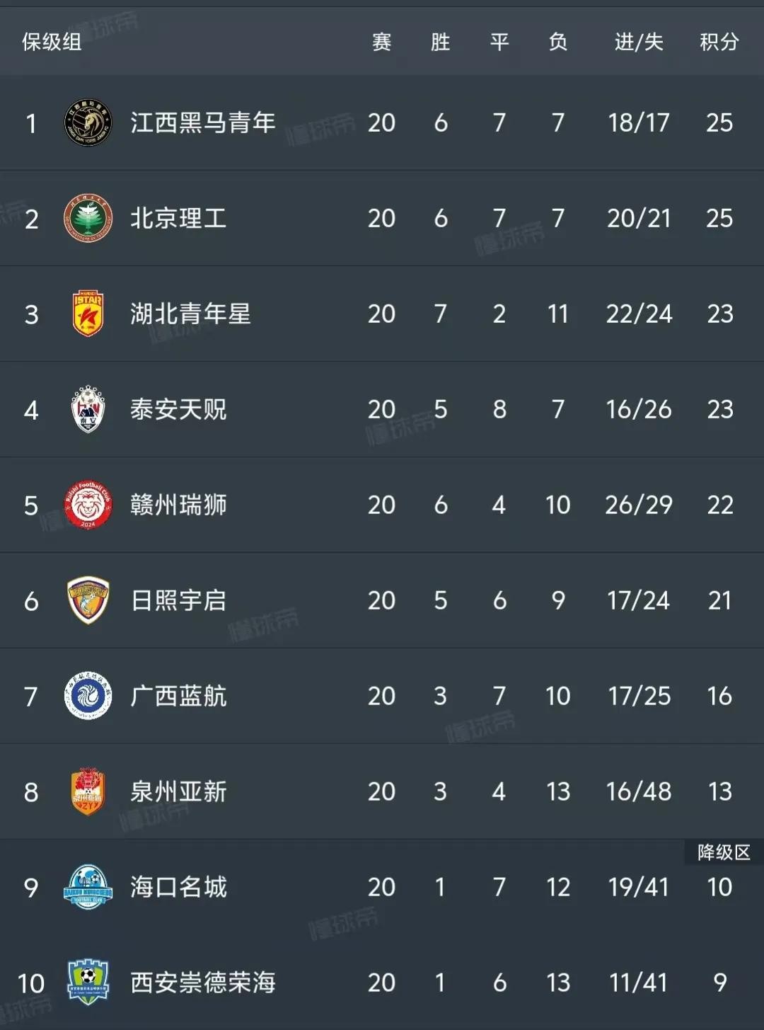 在保级组中,江西黑马青年、北京理工同积25分排在第一和第二位,湖北青年星、泰安天祝同积23分分列积分榜第三和第四位,赣州瑞狮22分排在积分榜第五位,日照宇启21分排在第六位,广西蓝港16分排在第七位,泉州亚新13分排在第八位,积10分的海口名城和积9分的西安崇德荣海排在保级组的第九和第十位。