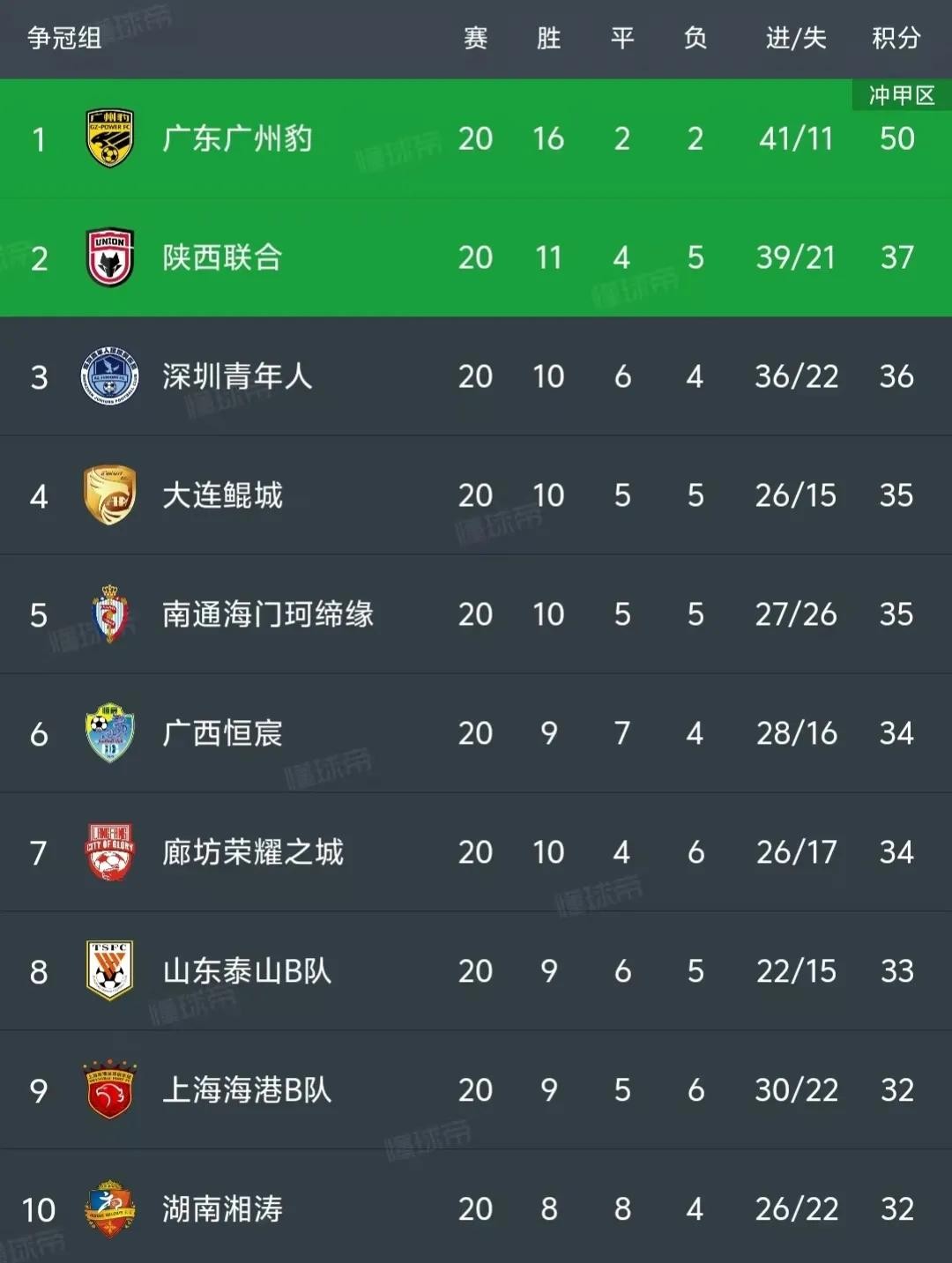 中乙最新积分榜:广东广州豹、陕西联合冲甲区,海口、西安降级区