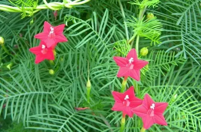 茑萝的花朵,像是一个一个红色五角星,精致又可爱,它可以用种子播种,基本室外养,也不太用打理就能长得很好,就跟牵牛花一样!