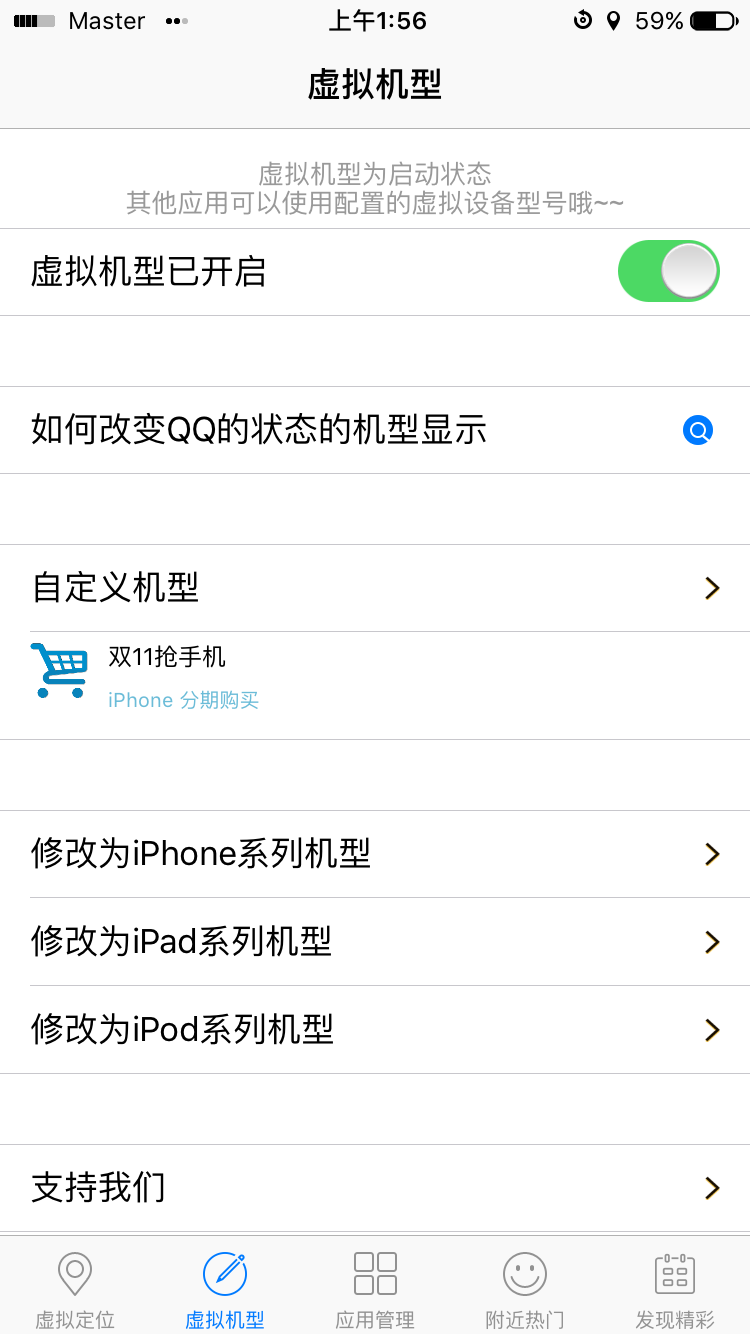 什么!虚拟定位,我要这个干吗?别急,虚拟定位可能很多人都用不到,但是,这个插件有个隐藏的功能,看到图了吧,这个插件可以修改手机机型,分分种变iPhone7 Plus,上个QQ,7Plus在线,发条说说,来自7Plus,这逼装得,装逼大军们收好啦!