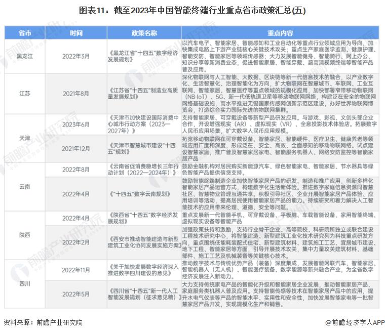 从地方层面政策来看,各省市提出智能终端推广应用及相关项目落地实施规划,加速推进地方智能终端产业快速提升。主要省市的发展目标汇总如下: