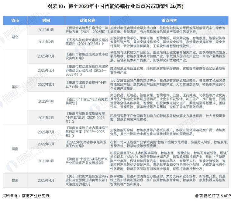 中国各省市在技术创新、行业应用推广和产业升级等方面制定了智能终端行业相关政策,促进行业的全面发展。近年来,中国重点省市智能终端行业汇总如下:
