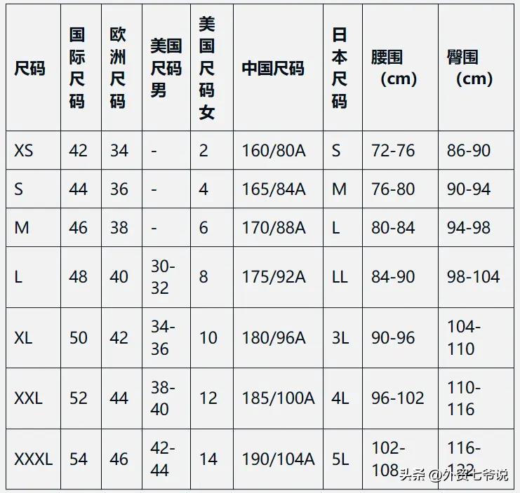 中美裤子尺码对照表:
