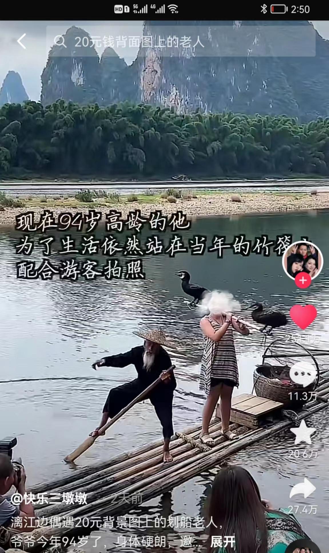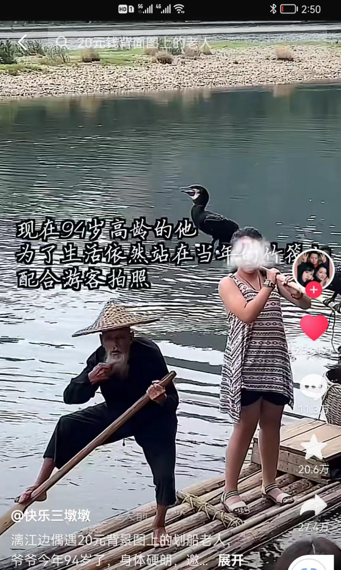近日有一位博主在漓江江边也想拍摄纸币与山水的结合画时,惊喜的发现画中的钓鱼翁居然还在漓江边划船,我们每个人都曾看过20元纸币,也曾无意间见过划船人的身影。