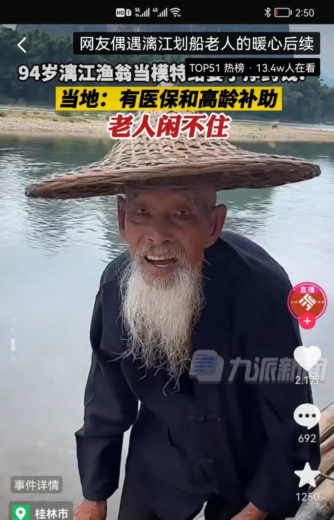 据了解,划船老翁名叫黄六四,现年已经94岁高龄了,老爷爷为人厚道,乐观开朗,面对游客总是一副笑脸。老爷爷是靠打鱼为生的渔民,一生逍遥自在。去桂林游玩的游客遇见爷爷都会和他合影,老爷爷每次都很配合。
