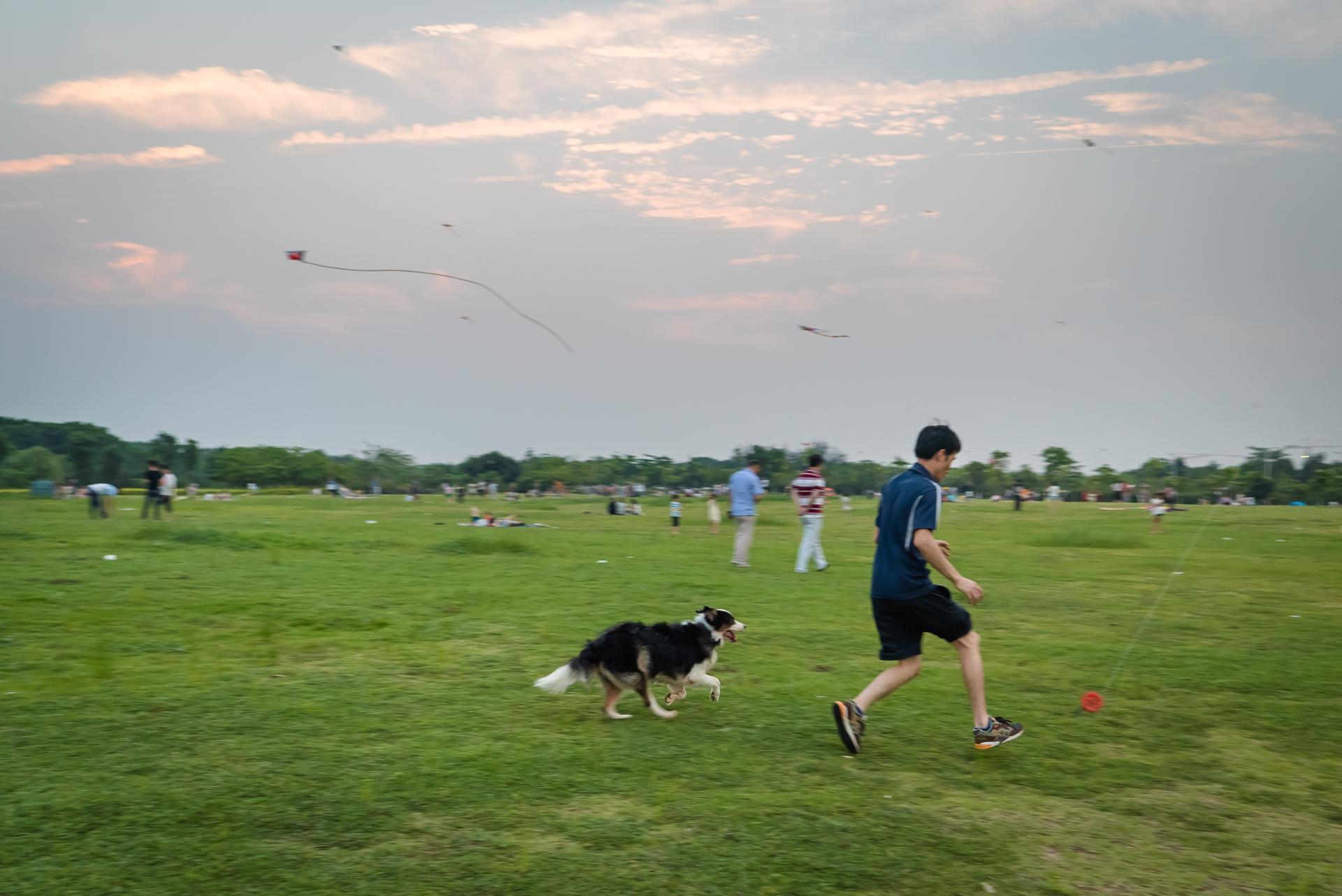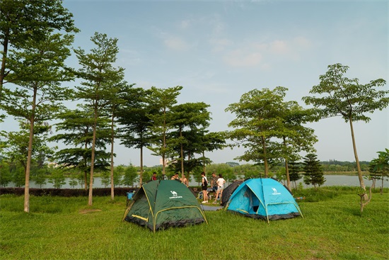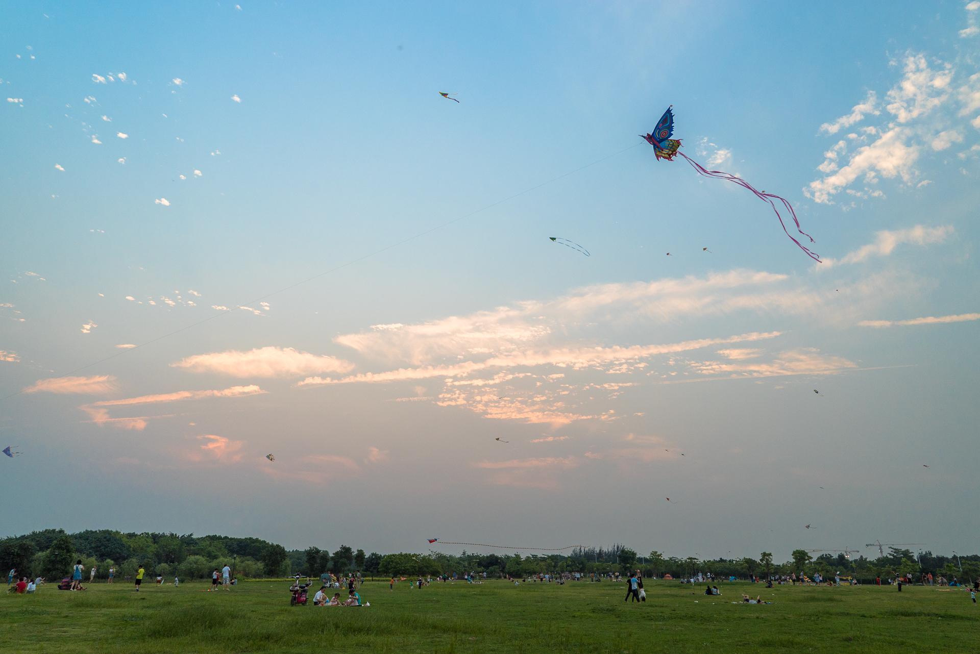 风筝广场草坪面积挺大,足够跑来跑去放风筝。不过可能假期原因,来玩的人不少,尤其到了傍晚,天气凉快起来,人就更多了。直至太阳下山,还有很多大人小孩舍不得收线回家,一直在玩。有些游客还带来了帐篷、户外烧烤装备,看架势是要扎营过夜了呢。