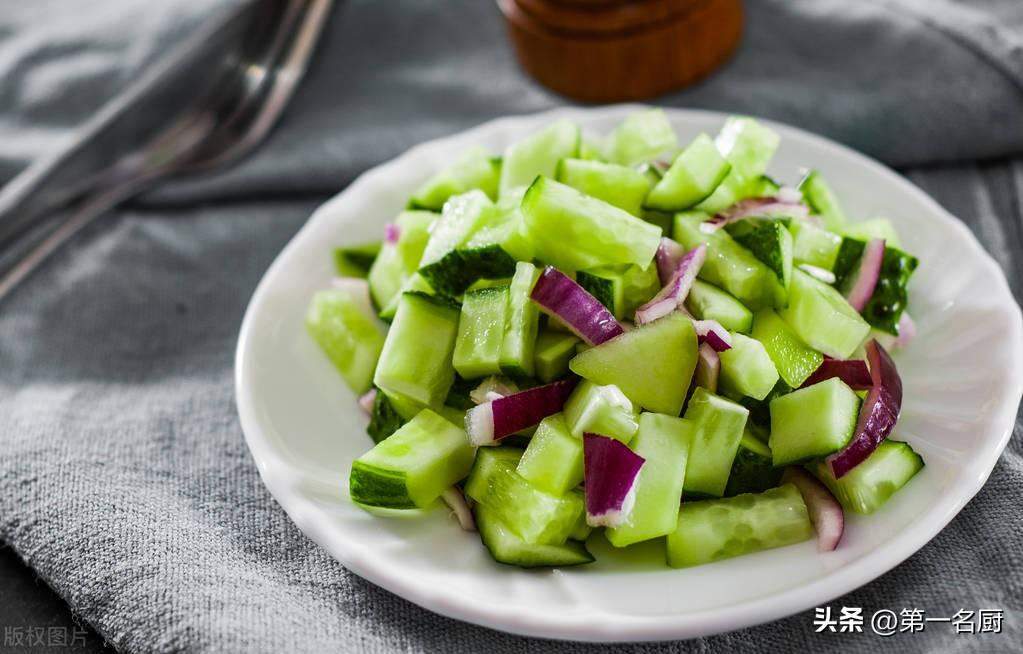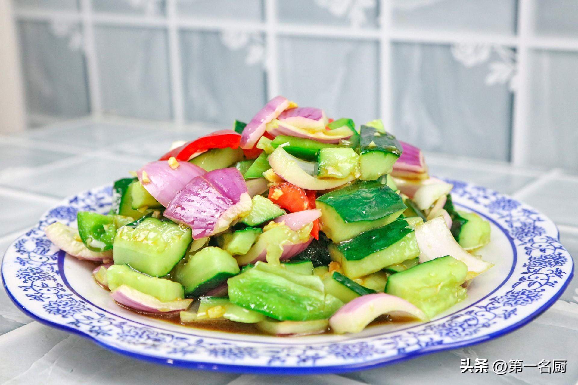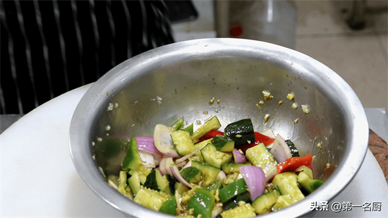 3.蒜子两粒拍扁切成蒜末,放入小盆中,加入食盐1克,白糖1克提鲜,味极鲜10克调味,陈醋10克,芝麻油3克,葱油3克,用筷子搅拌均匀,倒入装黄瓜的盆中,再放入洋葱和青红椒,颠盆拌匀,就可以装盘食用了。