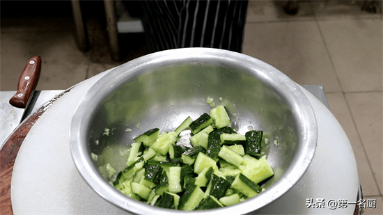 1.洗净的黄瓜一根,先切去头尾,用刀拍扁,切成2厘米宽的段,放入盆中,加入食盐2克,搅拌均匀,放在一边腌制5分钟。