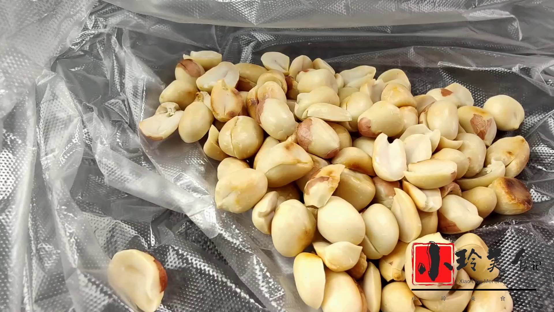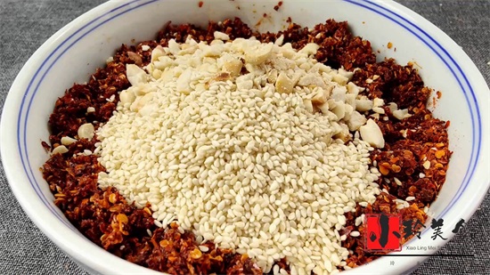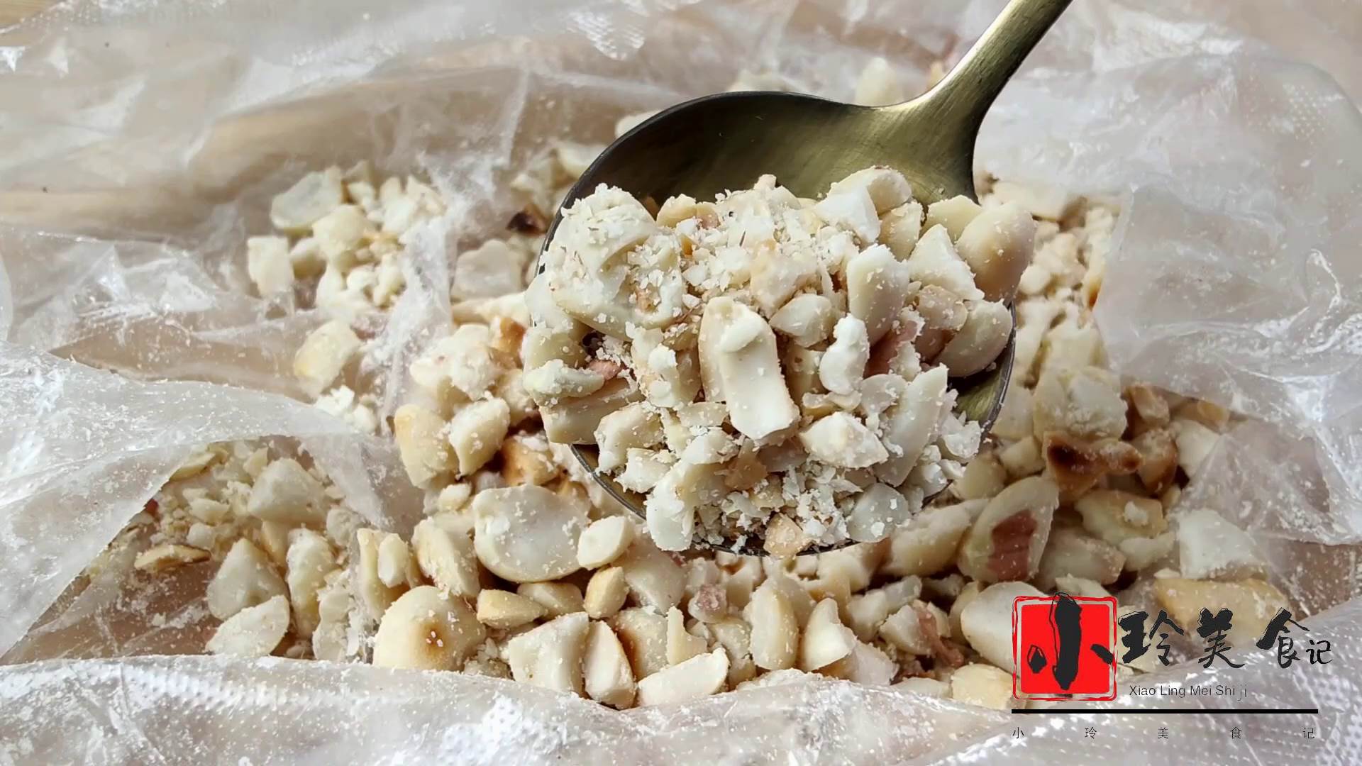 2:我们再来准备一小碗花生米,倒入锅里,开小火不停地翻炒,炒至能听见花生发出噼里啪啦的响声,盛出来晾凉,晾以后,我们给它去皮,倒入保鲜袋中,用擀面杖擀碎,不要敲的太碎,有点颗粒感吃起来更香,倒入辣椒面的碗里面,再加入两勺白芝麻,充分地搅拌均匀。
