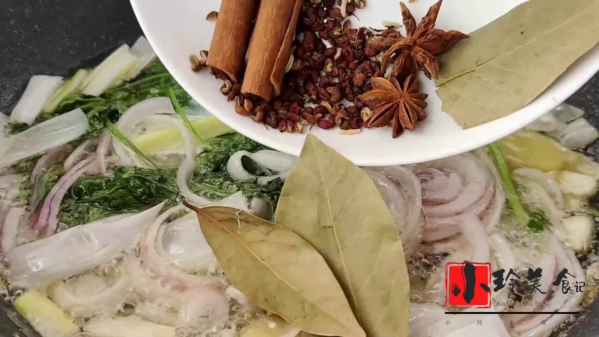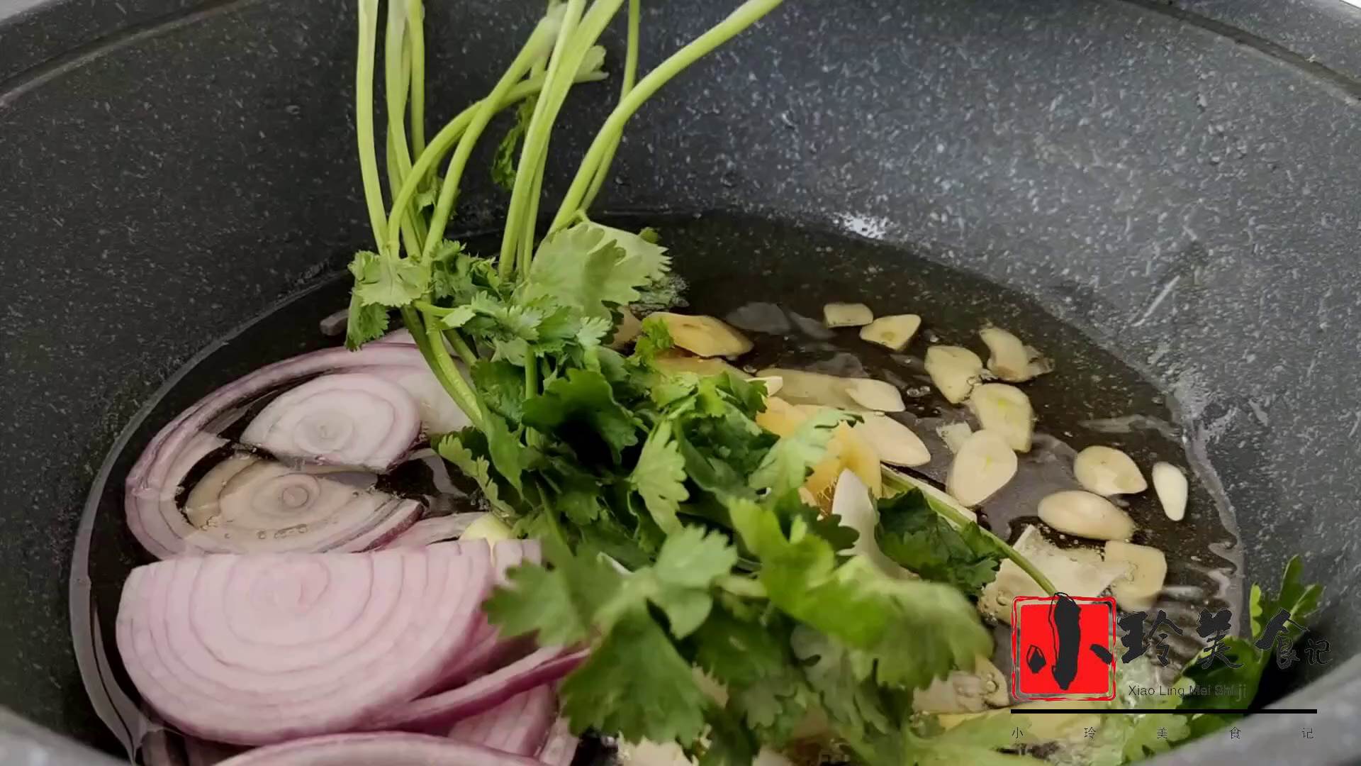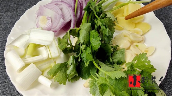 3:接下来我们准备适量的蒜片、姜片、香菜、洋葱片、大葱段备用。再来准备香料部分:2段桂皮,3朵大料,3片香叶、一小把茴香一小把花椒备用