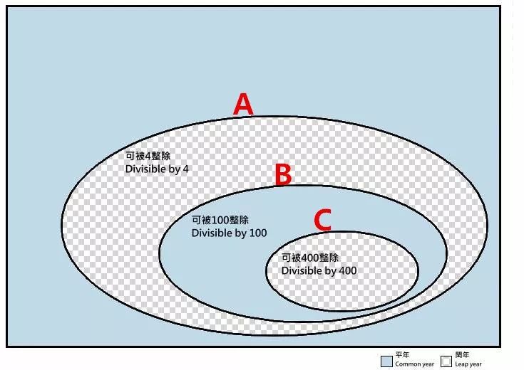 上面的规则说到了3个数:可被4整除的数(记为A)、可被100整除的数(记为B)、可被400整除的数(记为C)。