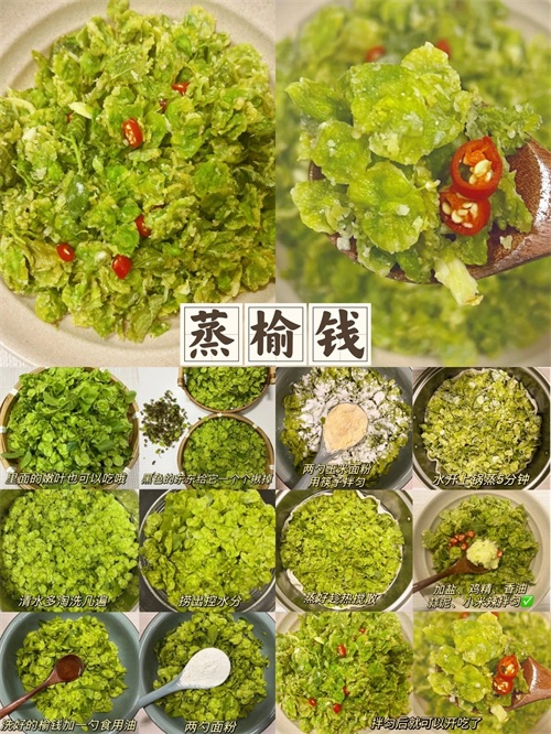 蒸榆钱:榆钱洗净控水后,加少许食用油搅拌均匀,让菜表面形成一层油膜,这样蒸菜营养水分不流失,而且松散不结团。然后分次加入面粉搅拌到每一片叶子、每一根丝都裹一层面粉,相互松散不粘连。放在蒸屉上,开水上锅,大火蒸3到5分钟即可。蒸好后倒出趁热加盐用筷子挑散搅拌均匀。放凉后加入蒜泥、香醋、小磨香油、生抽拌匀即可。